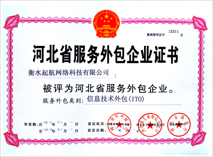 衡水起航網(wǎng)絡(luò)科技有限公司獲得由河北服務(wù)外包管理中心授予的《河北省服務(wù)外包企業(yè)證書》。